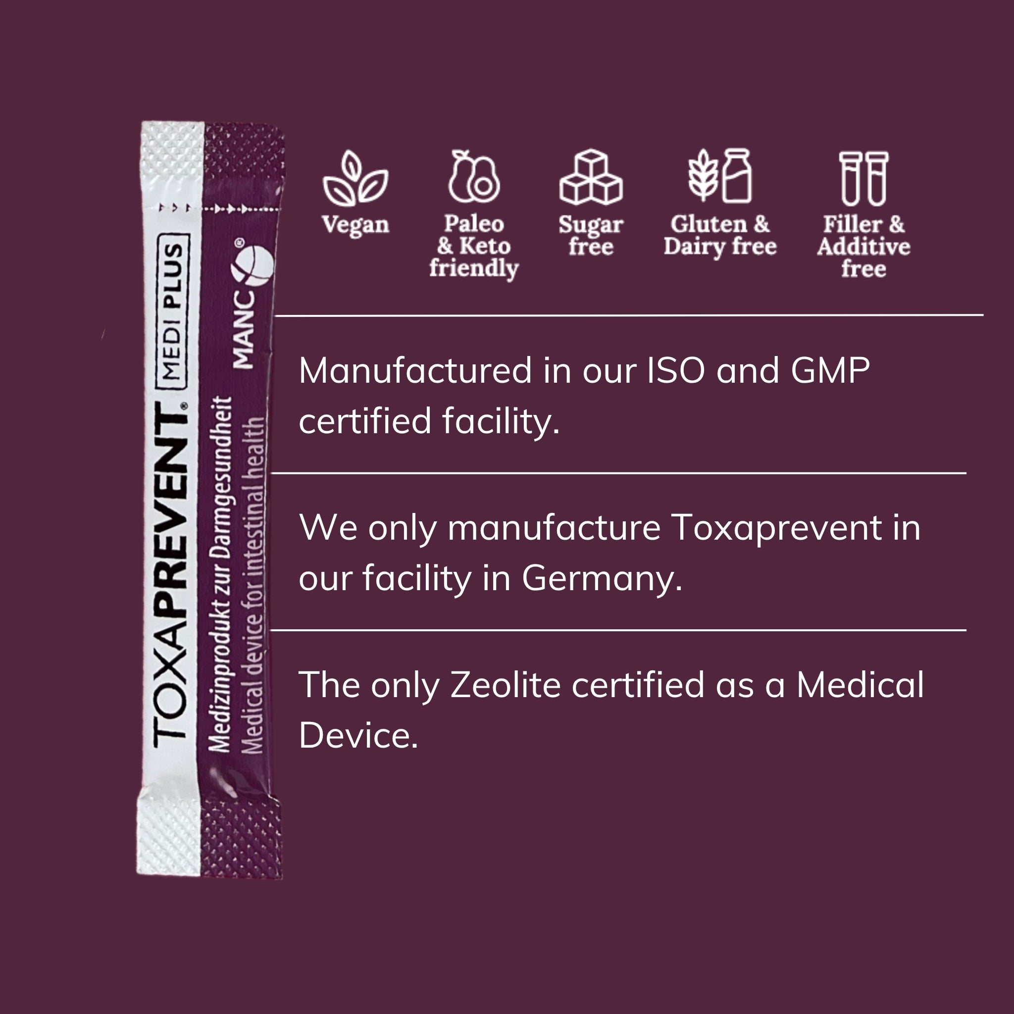 Each Toxaprevent Medi Plus Sachet contains 2400mg of MANC® particles (Modified Activated Natural Clinoptilolite) blended with 420mg calcium carbonate and 180mg magnesium carbonate.