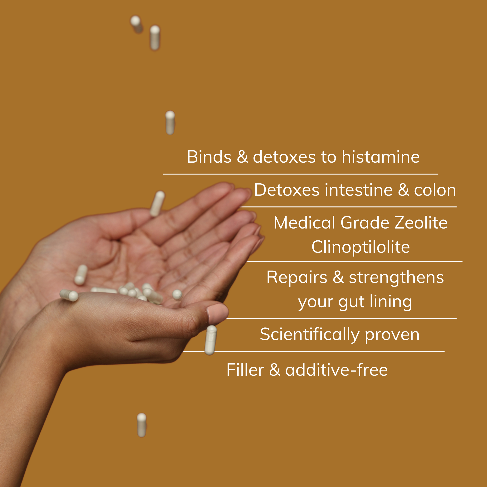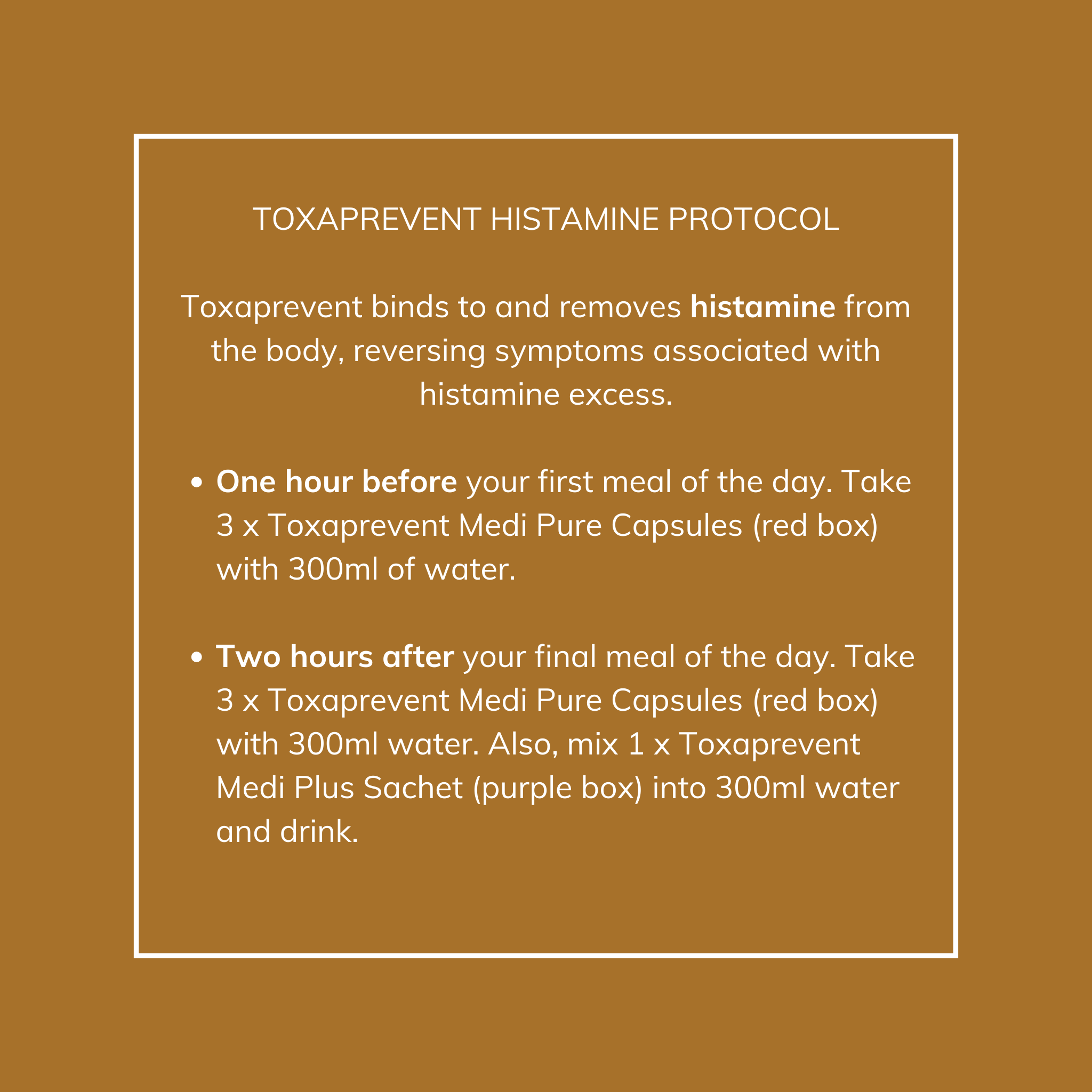 The Toxaprevent Medi Pure Capsules and Toxaprevent Medi Plus Sachets work together, mopping up and removing excess Histamine from the body and emptying your histamine bucket.