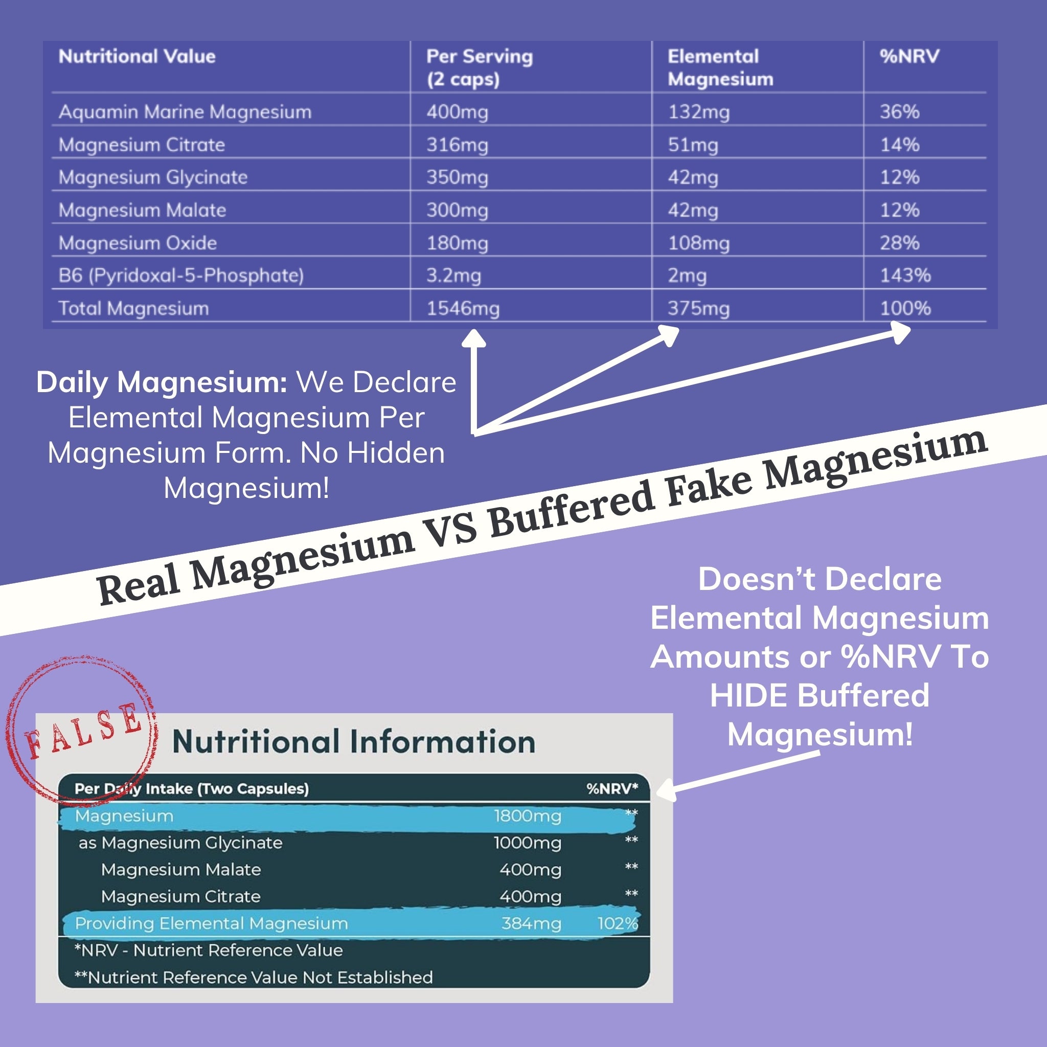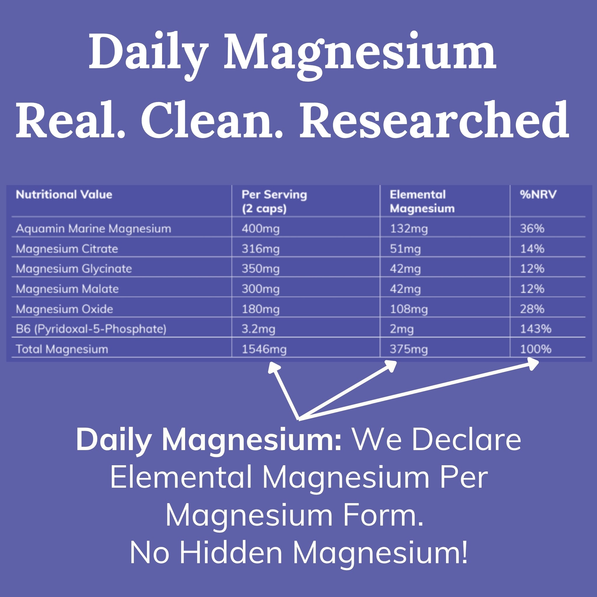 The only real, clean and proven 5 in 1 magnesium with glycinate, citrate, malate, marine, oxide blended with B6 to activate and increase the effectiveness of the magnesium.